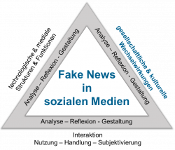 Um an den fächerübergreifenden Lernbaustein anzuknüpfen, ist auch der Lernbaustein PoWi inhaltlich auf den Nahostkonflikt ausgerichtet. Aus Sicht der politischen Bildung fokussieren wir uns nun jedoch auf das Phänomen Fake News in sozialen Medien, das ins Zentrum des Frankfurt-Dreiecks gestellt (siehe Abbildung 1) und mit Blick auf gesellschaftliche und kulturelle Wechselwirkungen detaillierter beleuchtet wird. Die Wahl des Fachs und der Perspektive des Frankfurt-Dreiecks ist hierbei exemplarisch. Ebenso können andere Aspekte ins Zentrum gestellt und aus den anderen Perspektiven beleuchtet werden.