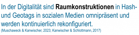 Im Zentrum der standortübergreifenden Zoom-Sitzung steht die kritisch-reflexive Auseinandersetzun Raum in der Digitalität. Wurde in den 1990er Jahren noch der Ansatz eines binären Raumverständnisses – der virtuelle Raum als Cyberspace und ihm gegenüber der reale, physisch erfahrbare Raum – verfolgt, entstanden neue Konzepte, die eine Trennung der beiden Sphären ablehnen. Da Internet und soziale Medien zu einem Bestandteil des Alltags geworden sind, gilt es, die sich so verändernden sozialen Interaktionen und Kommunikationsakte genauer zu beleuchten sowie neue Ansätze, Raum zu denken, zu erforschen.
