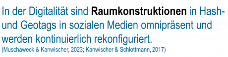 Im Zentrum der standortübergreifenden Zoom-Sitzung steht die kritisch-reflexive Auseinandersetzun Raum in der Digitalität. Wurde in den 1990er Jahren noch der Ansatz eines binären Raumverständnisses – der virtuelle Raum als Cyberspace und ihm gegenüber der reale, physisch erfahrbare Raum – verfolgt, entstanden neue Konzepte, die eine Trennung der beiden Sphären ablehnen. Da Internet und soziale Medien zu einem Bestandteil des Alltags geworden sind, gilt es, die sich so verändernden sozialen Interaktionen und Kommunikationsakte genauer zu beleuchten sowie neue Ansätze, Raum zu denken, zu erforschen.