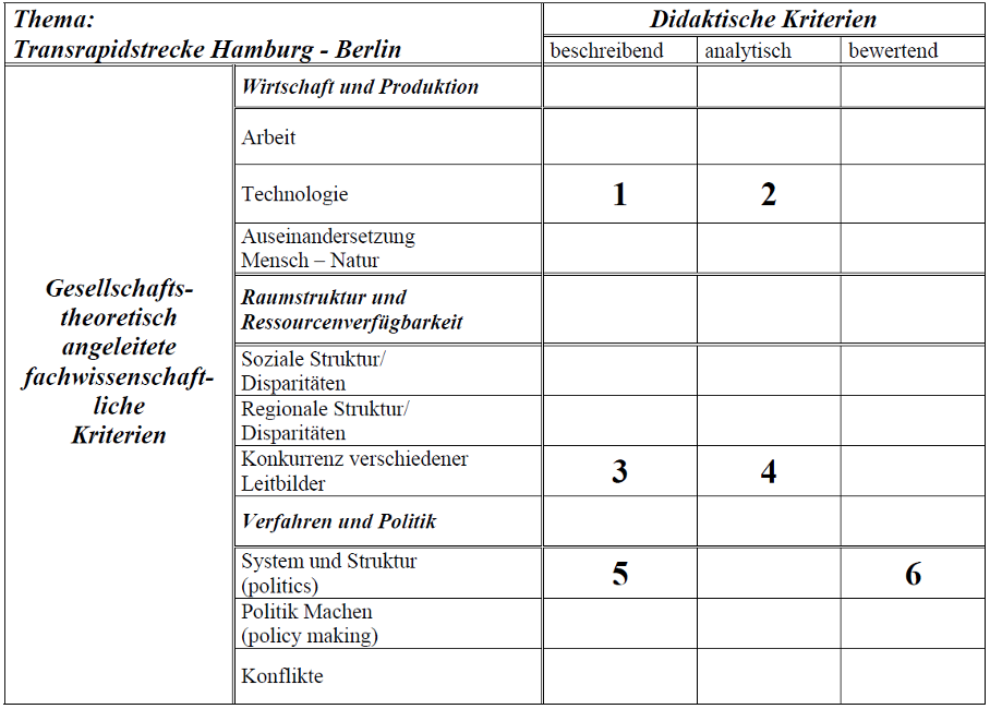 Ein kleines Beispiel soll zeigen, wie das Strukturgitter angewendet werden kann. Ich wähle als Lehrkraft für den Geographieunterricht den Fall „Transrapidstrecke Hamburg-Berlin“, den ich in einer Unterrichtseinheit behandeln möchte. Ein Entwurf dieser Unterrichtseinheit soll exemplarisch zeigen, wie mithilfe des didaktischen Strukturgitters eine Unterrichtseinheit geplant werden kann.