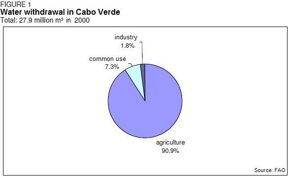 a)The graphic shows a pie chart which is divided into three sectors, a big one and two smaller parts. The title reveals that it deals with water withdrawal in Cabo Verde while the subtitle says that the total water withdrawal in Cabo Verde was 27.9 million m³ in 2000. Captions for each sector of the pie chart reveal that 90.9 % of the total water withdrawal account for agricultural use, 7.3 % account for common use, and 1.8 % account for industrial use.
